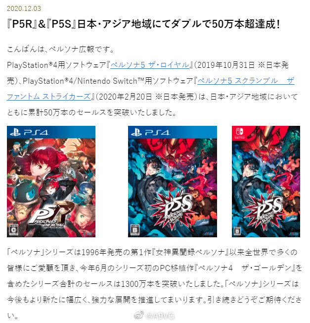 ATLUS宣布《女神异闻录5 皇家版》&《女神异闻录5 乱战:魅影攻手》在日本·亚洲地区销量均突破50万份,系列销量突破1300万份。