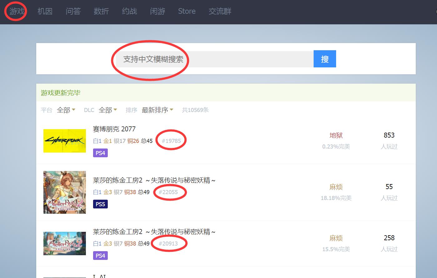 查询编号方法 到游戏按钮这里 搜索游戏名称 不用点击奖杯组了 游戏名称下面的奖杯右侧有#19785这个数字 就是游戏编号了