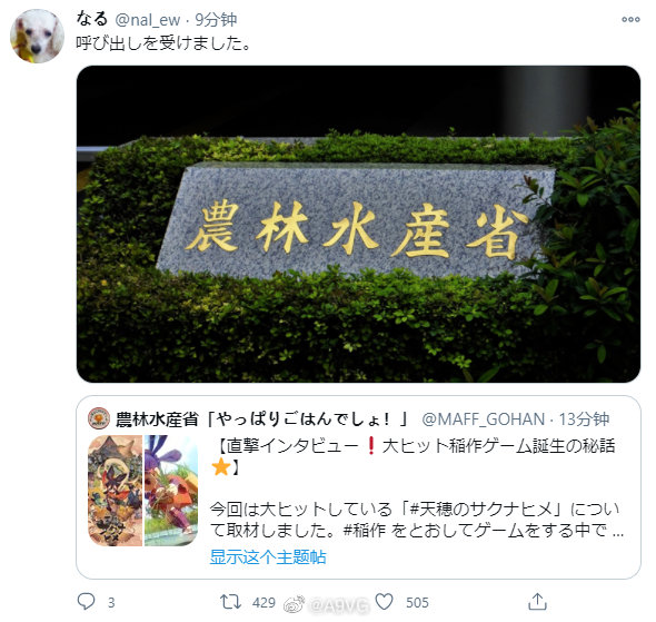 《天穗之咲稻姬》制作人nal(なる)被日本农林水产省“传唤”了,nal在推特上感叹:“没想到我居然会有因为做游戏而被叫去政府机关的一天……”