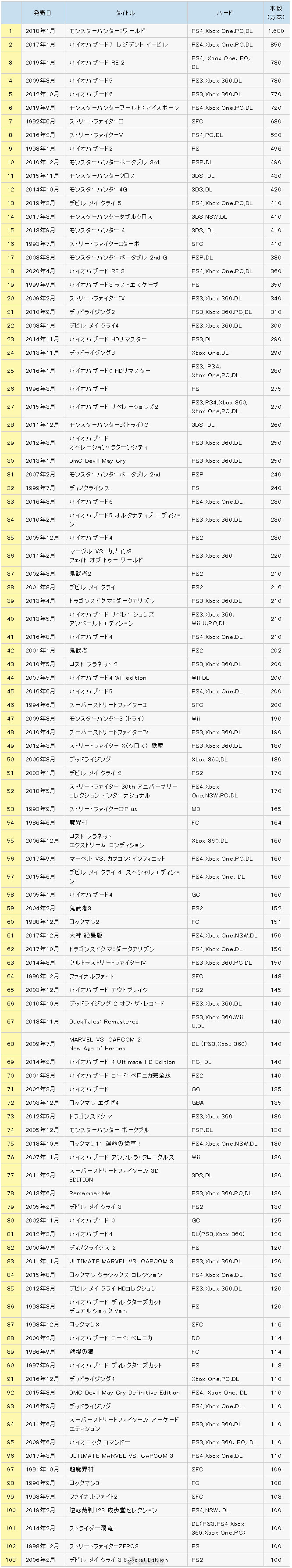 CAPCOM更新了旗下“白金作品(销量超百万)”截至2020年12月31日销售总数据和自9月30日以来的新增销量,详情如下: