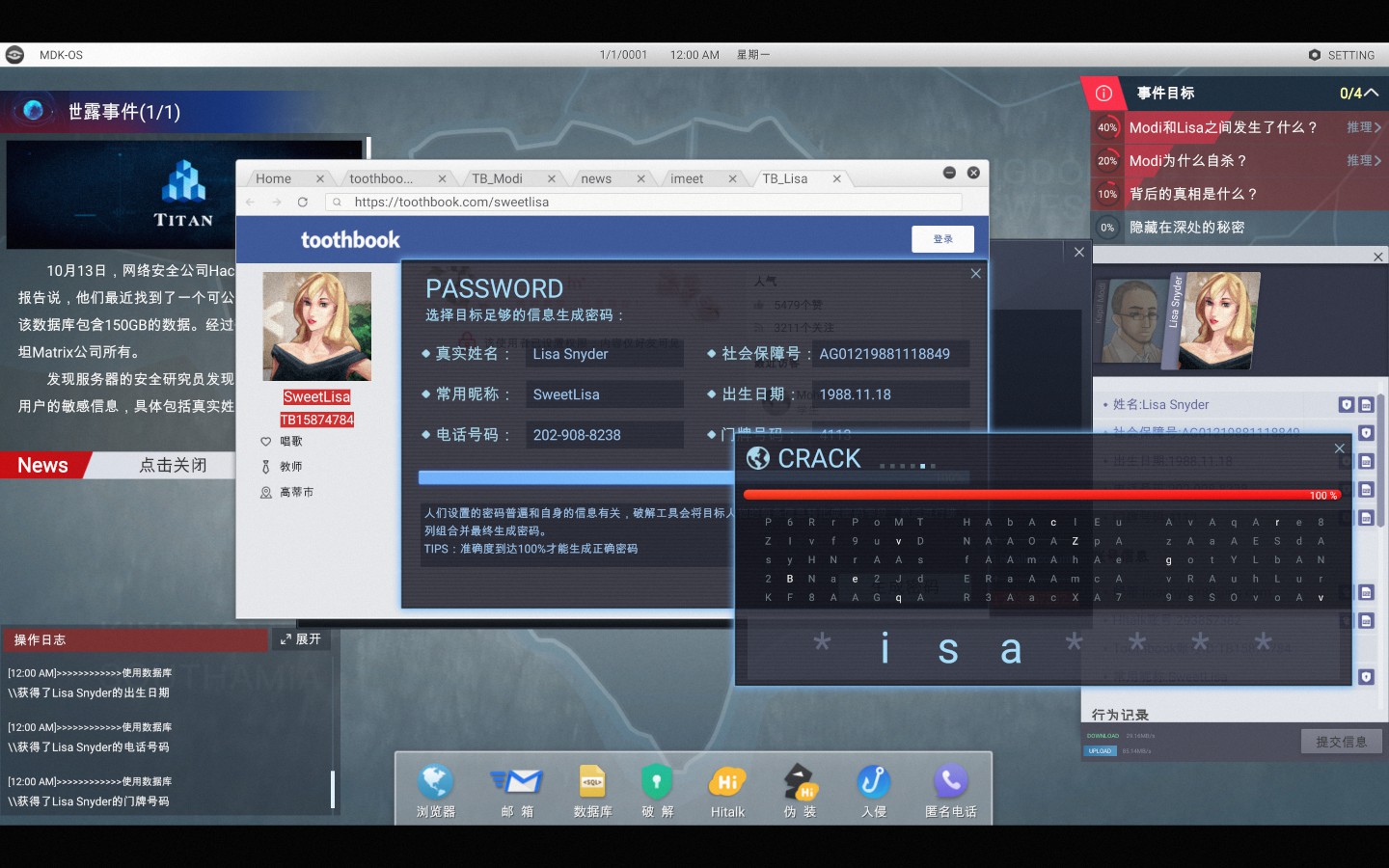 过年的时候全成就了,缺点就是中间基本都是得到名字,浏览器搜索,泰坦信息搜索,黑客库破解密码(为啥能破解密码我就不吐槽了),然后信息就全曝光了。有点流水线(复制粘贴,就算用快捷键也挺麻烦的)