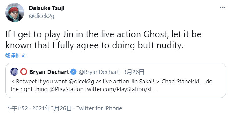 【境井仁扮演者:光屁股OK】最近《对马岛之魂》电影化的消息公布之后已经引起了许多话题,可能因为同样是在游戏中出演的演员,在《底特律》中饰演康纳的Bryan Dechart发推号召大家支持饰演境井仁的演员辻大介在真人电影版中扮演境井仁。