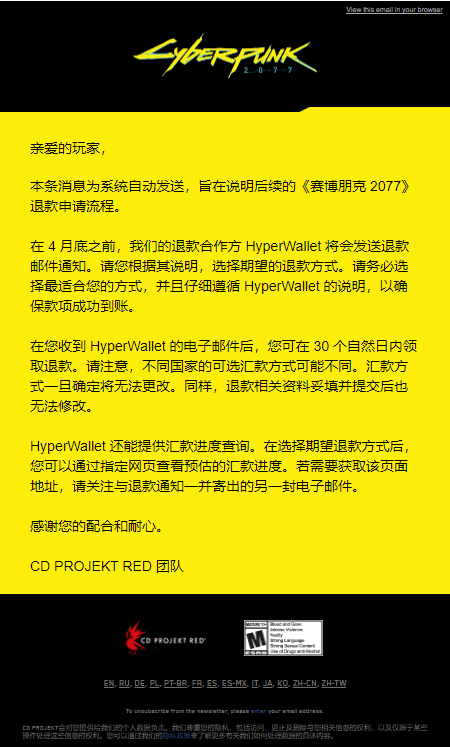赛博朋克2077实体版退款新进度?(之前让选择退款方式的时候我没选PayPal)