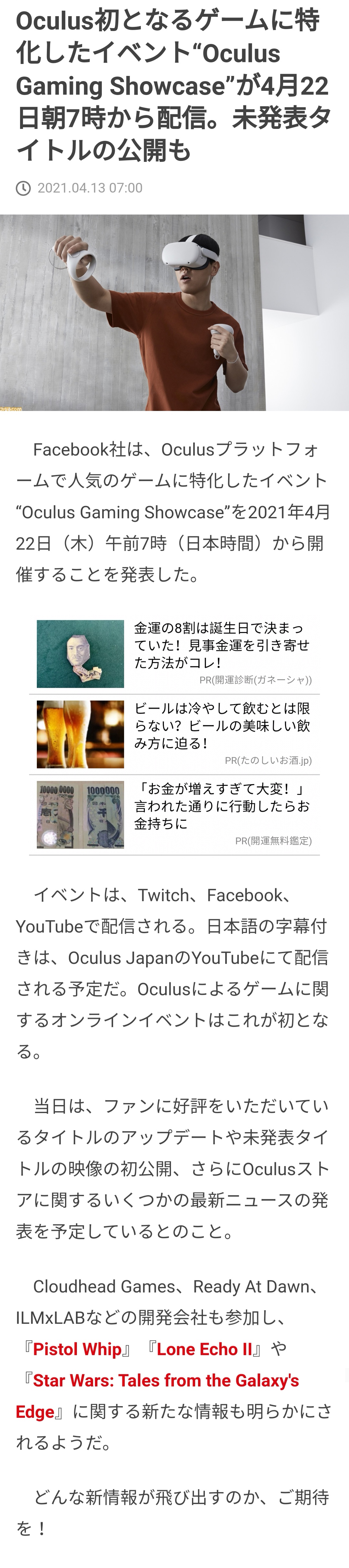 Oculus宣布,将于4月21日(北京时间4月22日6时)首次举办游戏专项主题的发布会,届时将会公布全新的游戏作品。