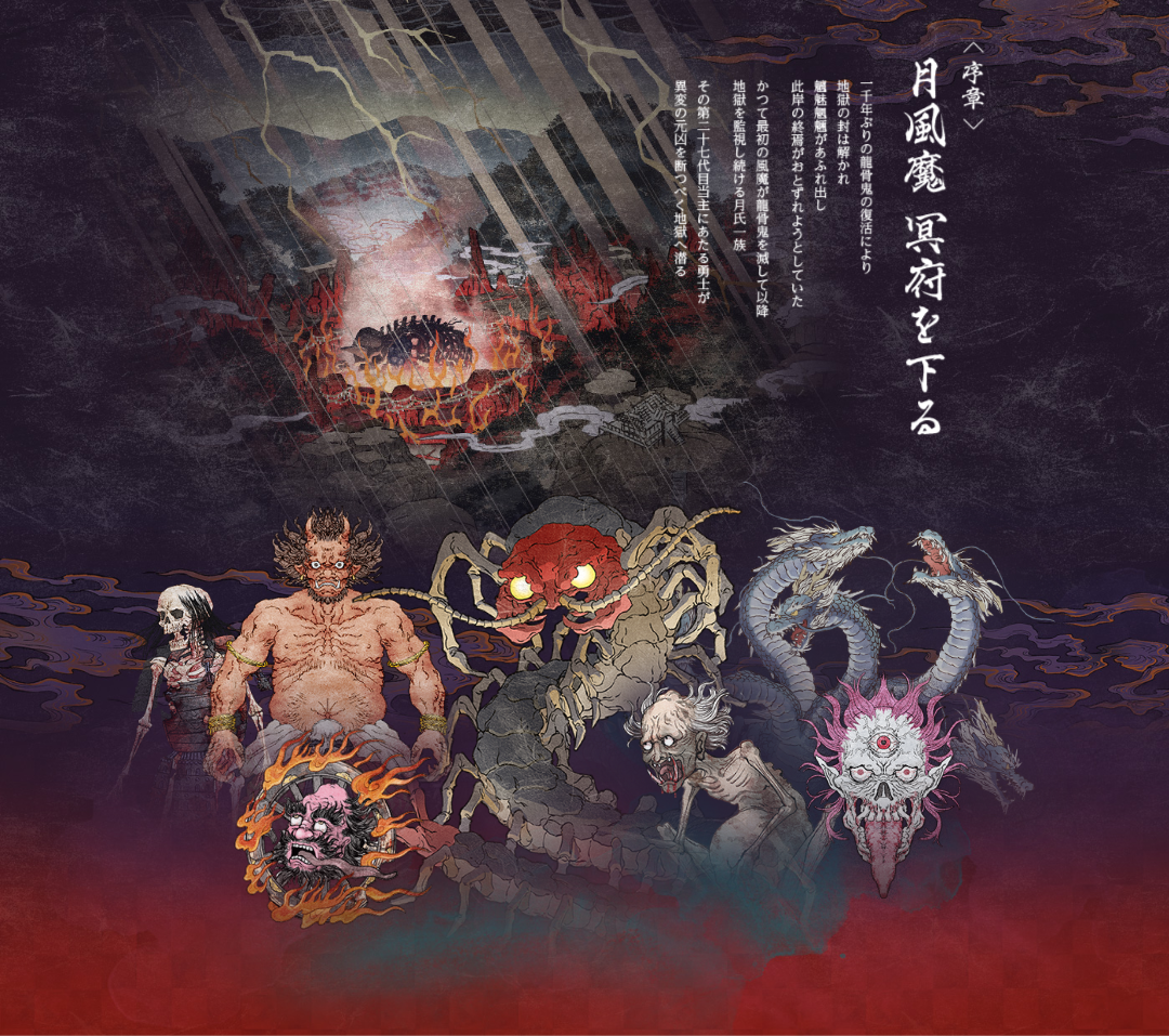 主角月风魔是月氏第二十七代目,也就是初代《月风魔传》的子孙,历经首次讨伐战 1000 年后龙骨鬼再次解除封印复活,月风魔将继承先祖的遗志为家人而战。