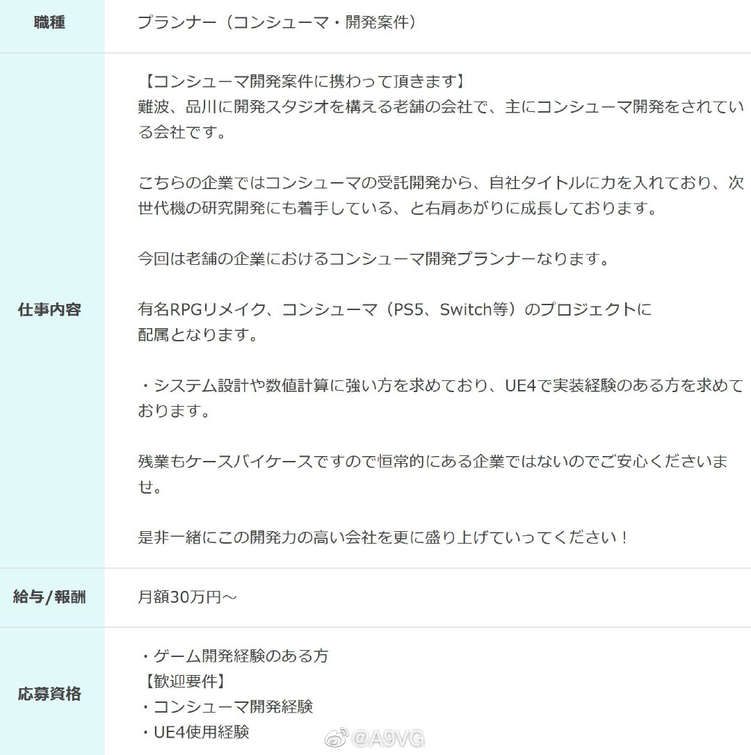 在日本难波、品川设有工作室的某游戏开发公司(从地址上判断最符合该条件的是HEXADRIVE),在日本招聘网站「FELLOWS」上发布了一则招聘启事,启事中写道,公司正在开发一款知名RPG游戏的重制版,登陆平台为PS5与Switch等,要求应聘者需有主机游戏开发经验以及UE4使用经验。(图2为HEXADRIVE曾负责过的项目)