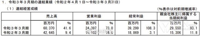 光荣特库摩今日公开20-21财年年度财报,该财年销售额、营业利润等项目成绩均创历史新高。详细数值:销售额603.7亿日元,同比增长41.6%,营业利润243.97亿日元,同比增长73.0%。