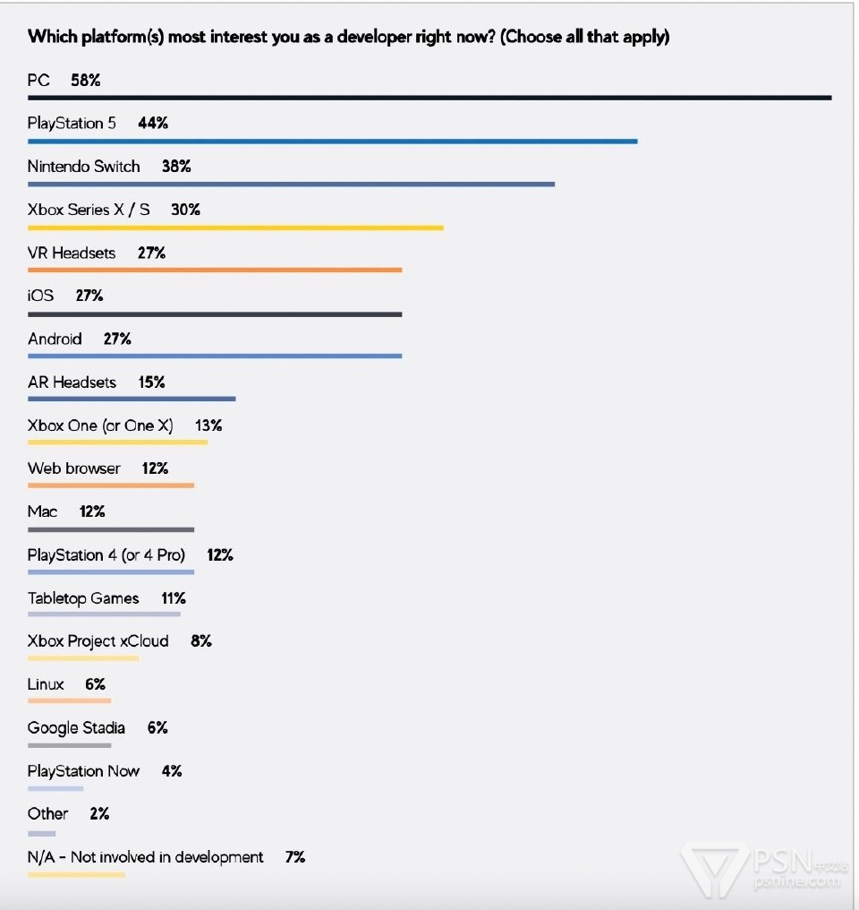 游戏开发者大会(GDC)公布了《2021年游戏行业状况报告》,报告中做了多项调查。其中有一项调查问题是「作为一名开发者,你想为什么平台开发游戏?」,这个调查中PC获得了58%的得票率,PS5以44%得票率紧跟其后,其次是NS(38%)和Xbox Series X|S(30%)。