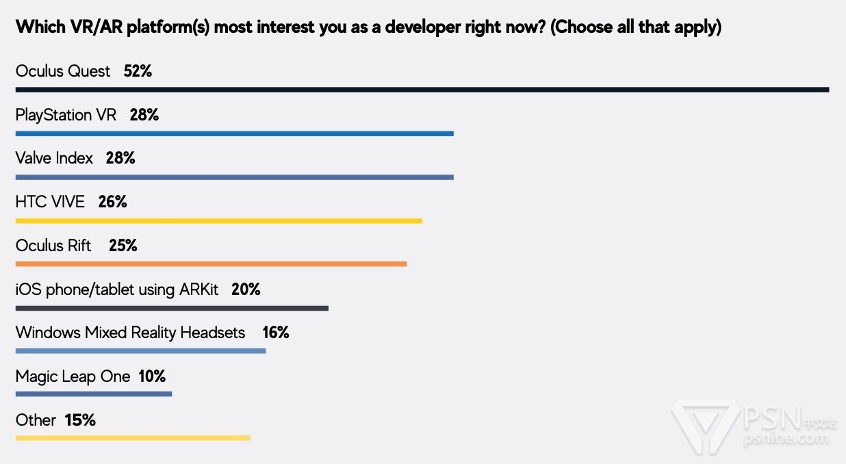 VR游戏方面,Oculus Quest以52%的得票率成为最受开发者欢迎的VR游戏平台,紧随其后的是PlayStation VR以及Valve Index,他们得票率均为28%。