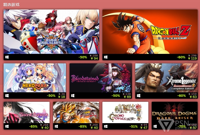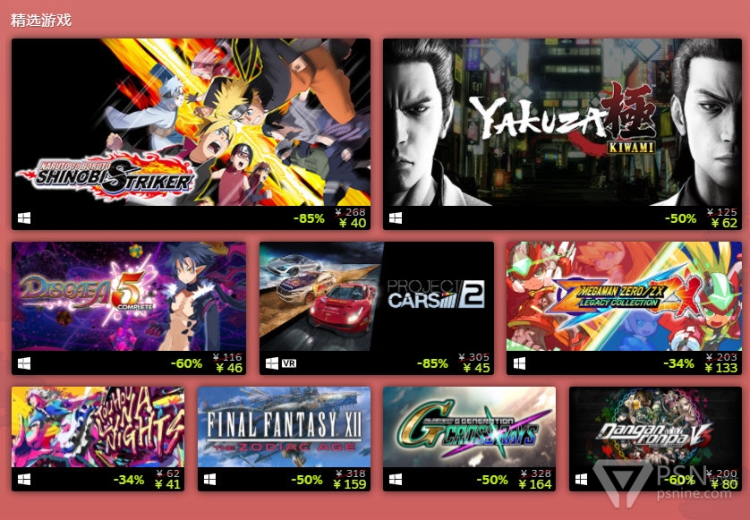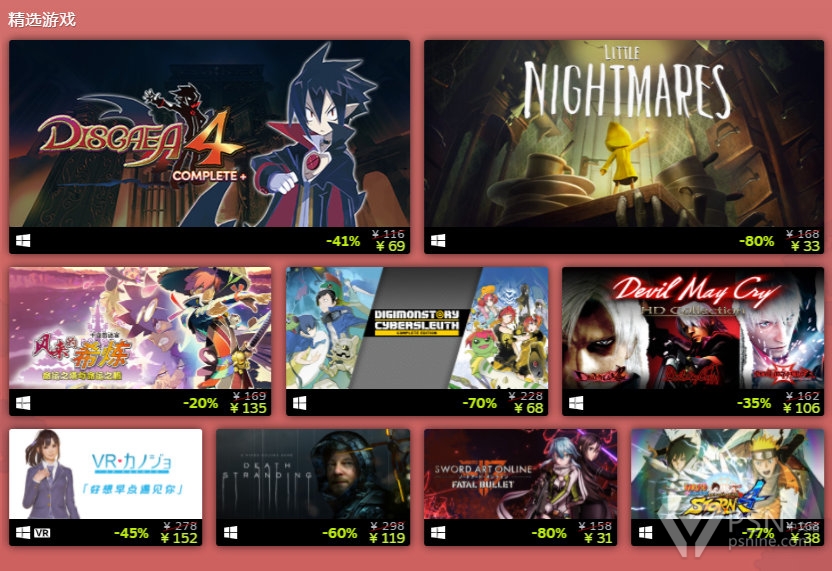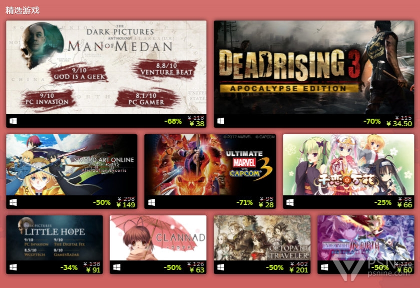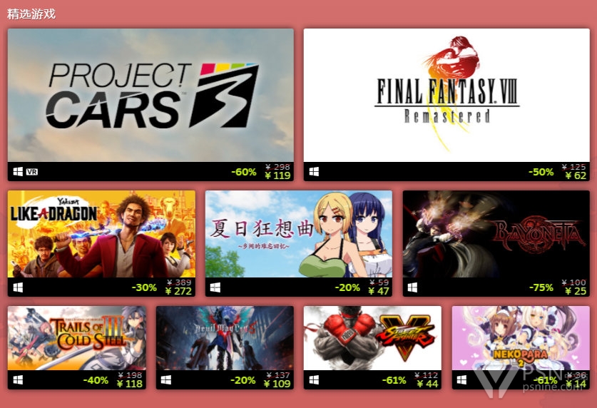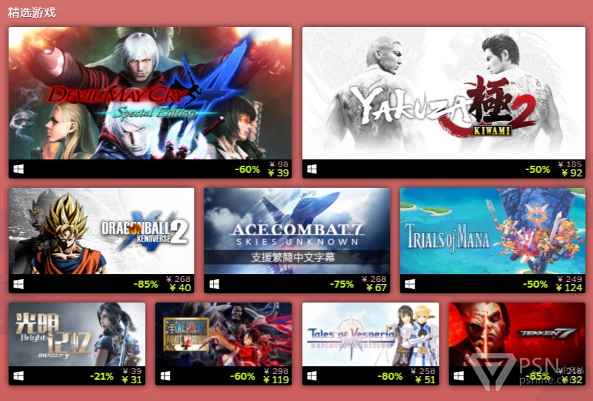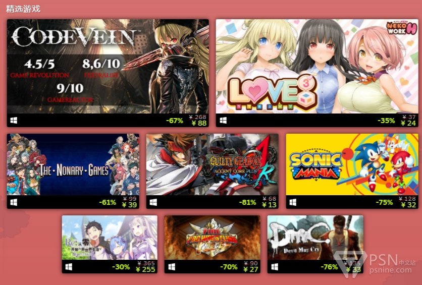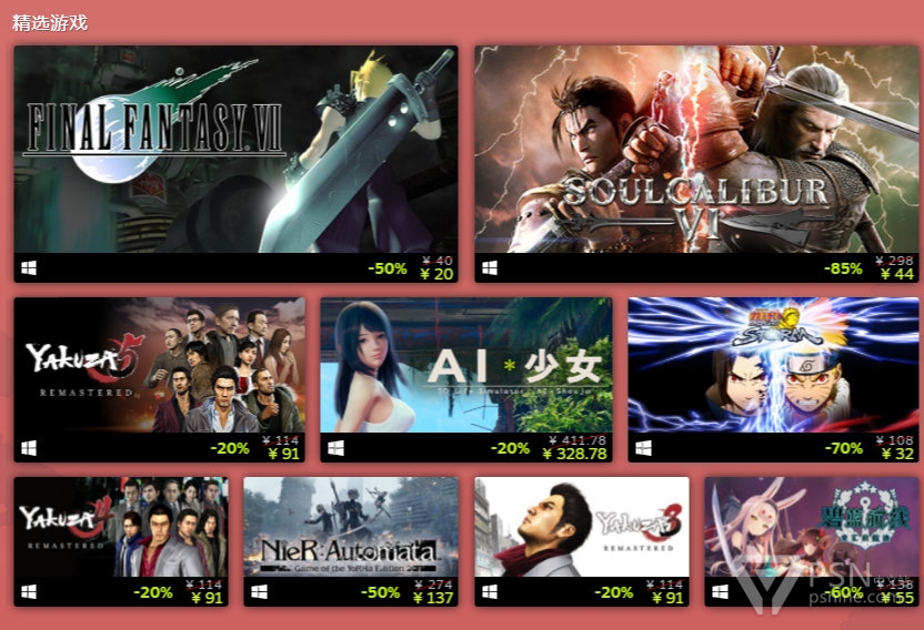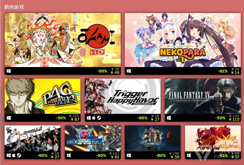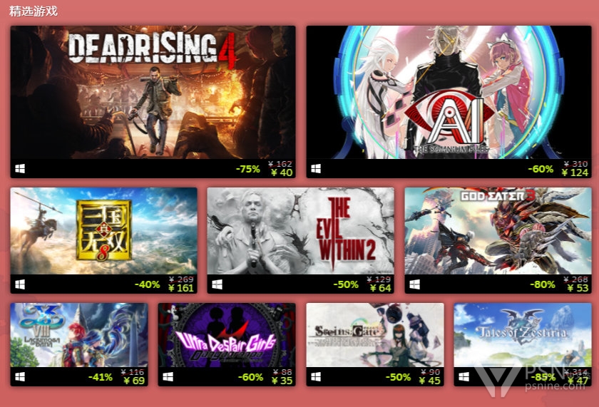 如《生化危机》系列、《最终幻想》系列、《弹丸论破》系列、《女神异闻录4 黄金版》、《AI 少女》、《如龙》系列、《命运石之门》系列等均有不同程度的特惠。