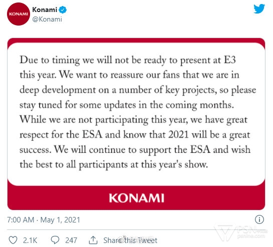 KONAMI通过官方推特发表声明宣布将缺席E3 2021,但同时表示目前公司有一些“关键项目”正在“深入开发”之中,并会在未来几个月分享相关更新,请各位关注