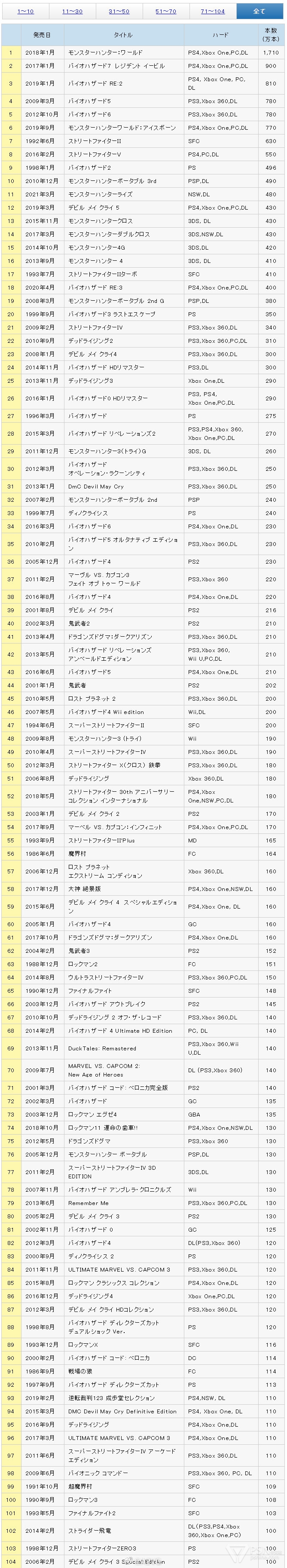 CAPCOM今日更新旗下“白金作品(销量超百万)”截至2021年3月31日销售总数据和自12月31日以来的新增销量,值得一提的更新如下: