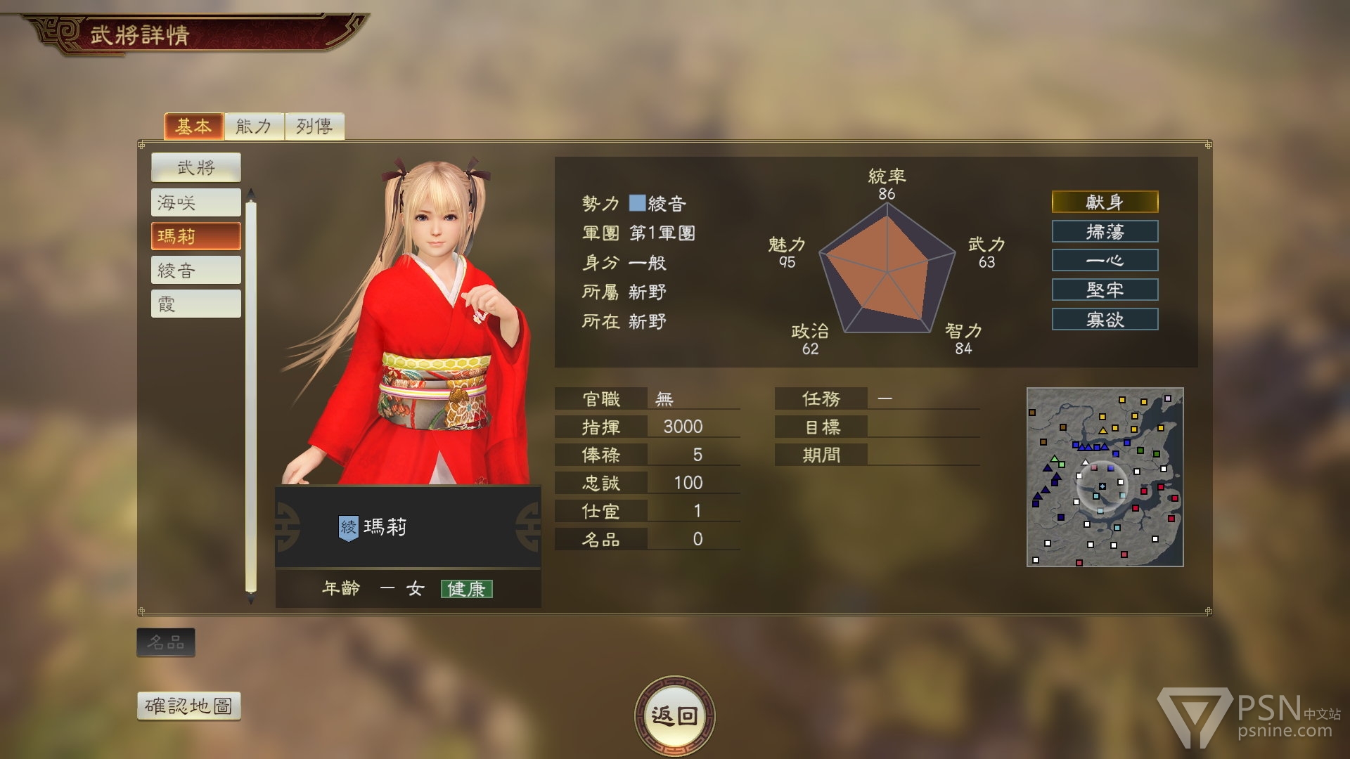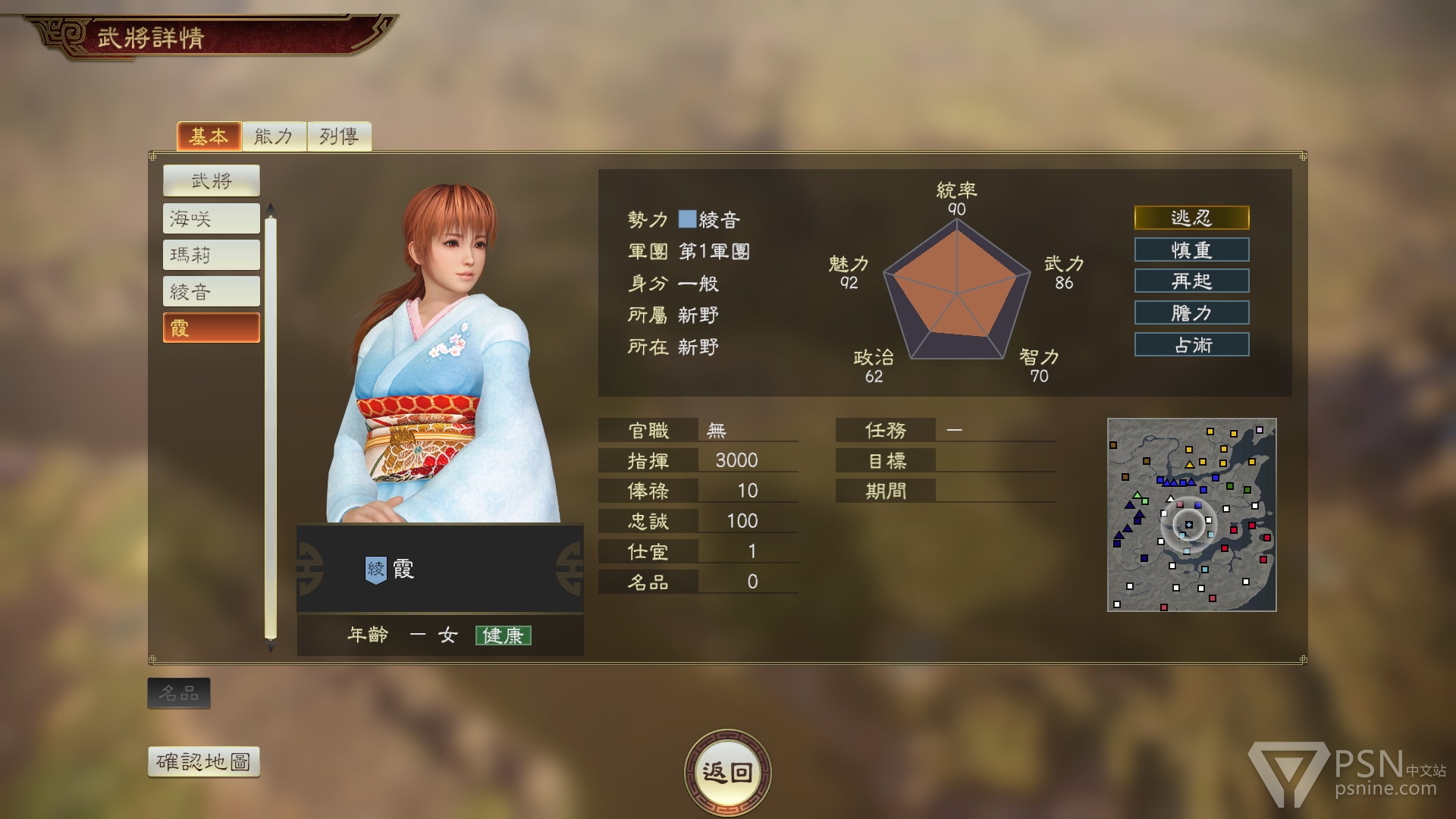 霞是历史悠久的忍者一门的继承人,她的个性“逃忍”可提升自部队的机动,不会成为俘虏;而战法“樱花天舞”则可以给予目标敌人依武力而异的伤害,并使其止步。