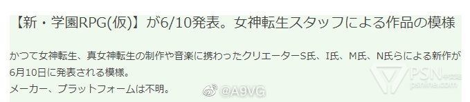 速报消息,由曾参与过《女神转生》《真女神转生》游戏开发与音乐制作的创作者们所打造的“新·学园RPG(暂名)”将于6月10日发表,具体开发商与登陆平台暂时不明。