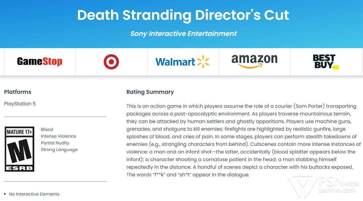 《死亡搁浅:导演剪辑版》已在美国完成评级,登陆平台为PS5。同原版一样,ESRB为本作评了M级(17+)。相较于原版,导演剪辑版的「评级概要」中多出一句描述:“在某些情况下,玩家可潜行击杀敌人(例:可从背后勒死敌人)”。