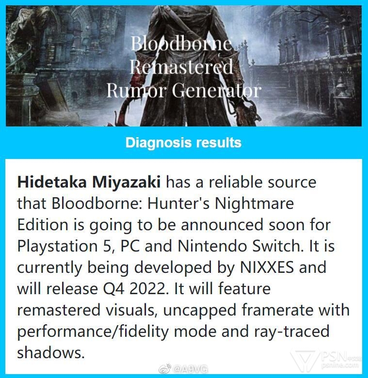 【《血源》传闻生成器】关于《血源诅咒》的传闻一直层出不穷,光是今年就传出了精神续作《天鹅绒帷幕》、PC/PS5《血源诅咒 高清版》、PC/PS5《血源诅咒 无尽的夜曲》这些种类丰富的传闻。本次Twitter用户isbbonpc自制了一个《血源》传闻生成器,只要一键输入舅舅名字,就能生成一个让你惊喜的传闻!范例见配图,暂无中文,传闻生成器见出处。