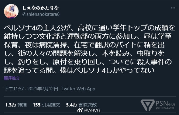 “《女神异闻录4》的主角,上高中保持年级成绩名列前茅的同时,还参加了文化部与运动部的活动,白天负责小学生的课后托管,晚上清扫医院,在家时还要做翻译兼职,不断解决“村”里人烦恼的同时,还有空读书、捕虫、钓鱼、骑着摩托车四处遛弯,顺便追查一下杀人事件。在他做这么多事的期间,我却只能玩个《女神异闻录4》。”