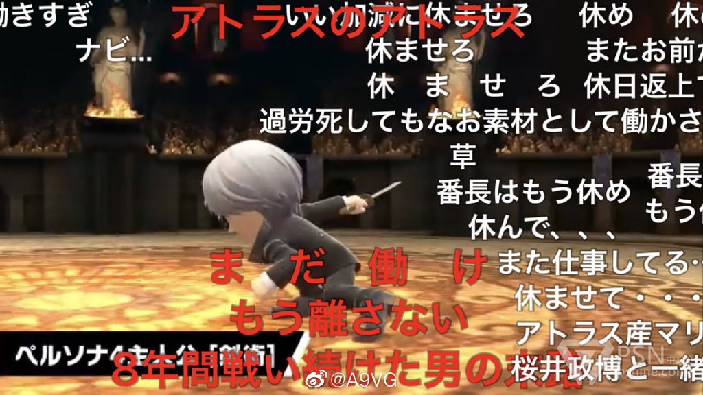 除了本传游戏内十分忙碌外,番长在本传外也一样过劳,因此在某期《任天堂明星大乱斗:特别版》的直播节目中出现番长的身影时,弹幕纷纷呐喊:“让这个男人歇歇吧!!”“持续战斗了8年的男人的末路”“ATLUS的阿特拉斯(擎天神)”。(图3)