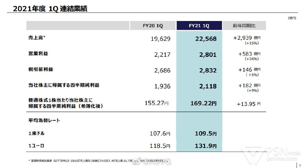 索尼今日公开21-22财年Q1(4月~6月)财报,该季度销售额及金融业务收入22568亿同比增长15%、营业利润2800亿日元同比增长26.3%。