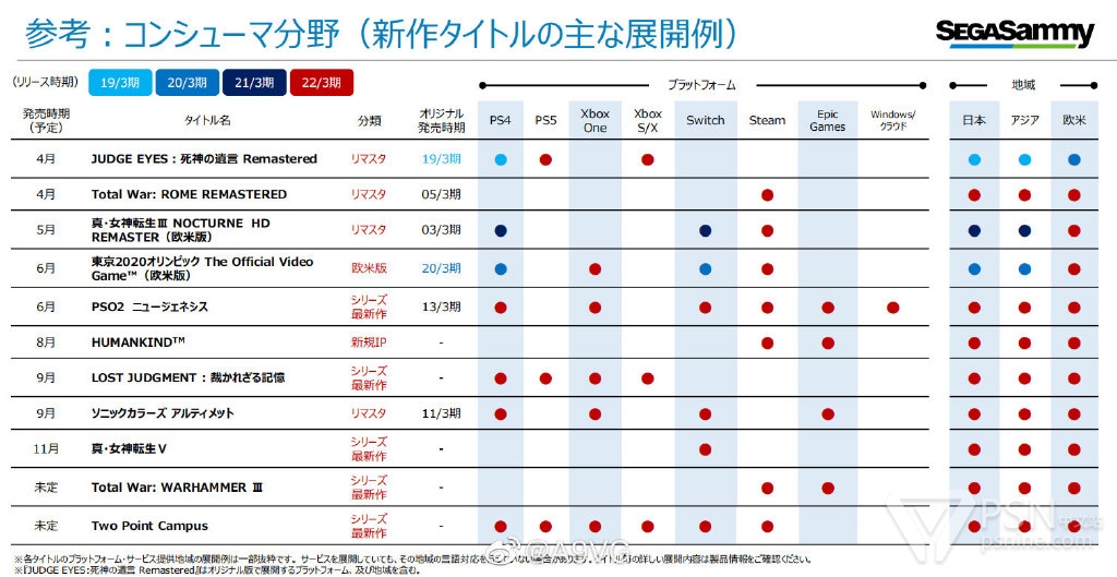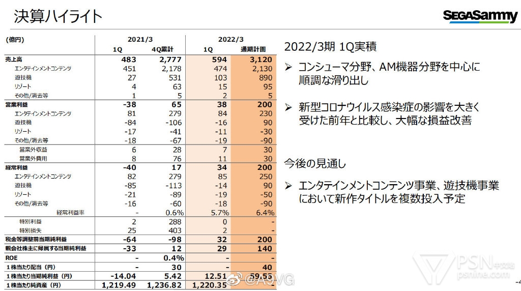 该季度的娱乐内容业务继续保持良好势头,其中主机游戏方面,网游《梦幻之星在线2 新起源》正式开服,此外还推出了一些游戏的欧美版与复刻/移植版,并没有什么特别值得一提的全新大作,游戏软件总销量为658万份(上一财年同期为1298万份),街机业务也逐步恢复。最终销售额达474.4亿日元,同比增长了5.1%。未来会有《审判之逝 湮灭的记忆》《真女神转生5》等多款新作发售。