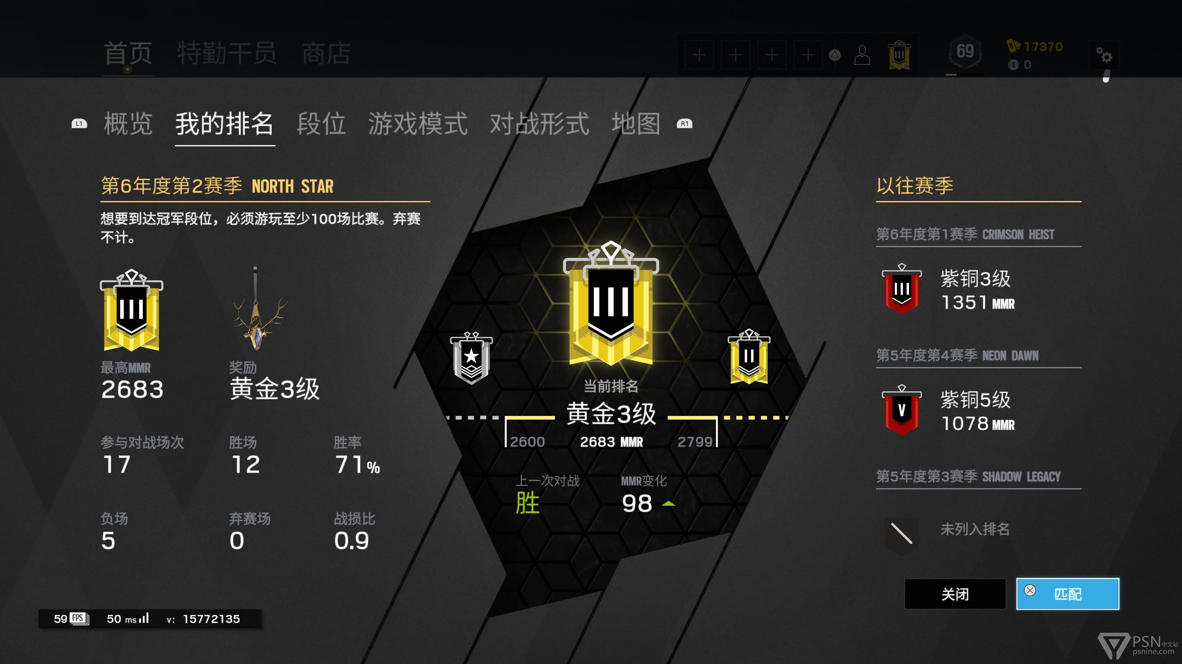 几年前r6吧主帮我打上的白金,我最多定级到黄金,然后开始下分
