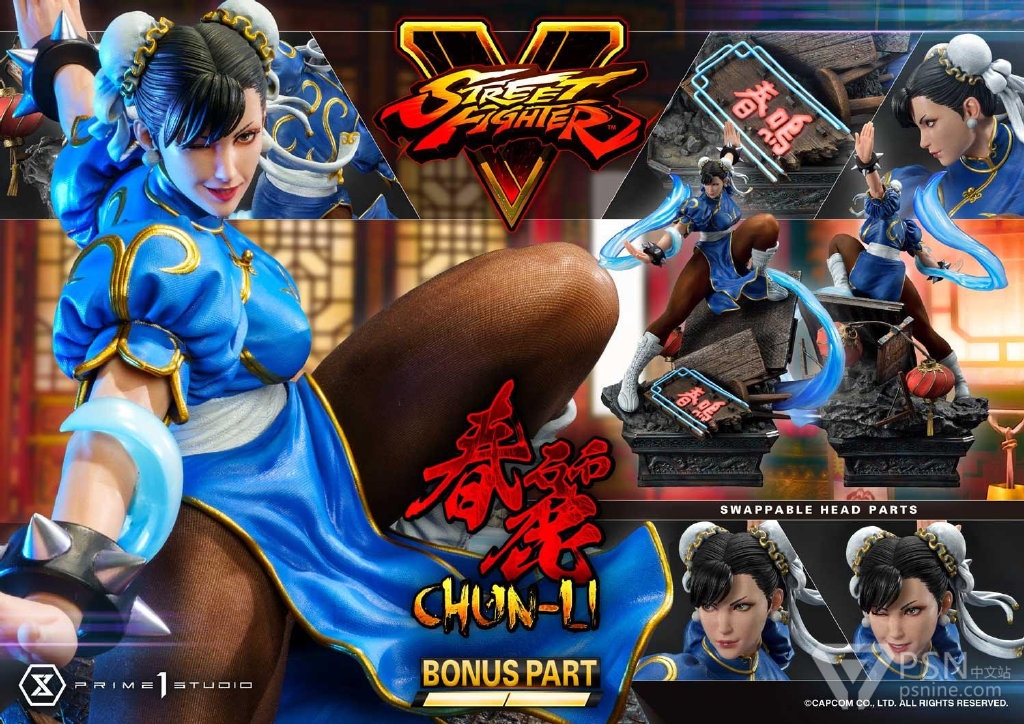 此外,BONUS版更附加一个可爱调皮的眨眼表情可替换头雕,千万小心不要因为被她的表情迷倒而中了她的百裂脚的攻击!春丽身边包围着一圈必杀技储气,她正在中国大舞台主题底座上面大肆破坏;地上更配有被拆毁的霓虹灯、中国灯笼和逼真的瓦砾。春丽可以与同系列的PMSFV-01豪鬼和PMSFV-02隆一起展示,以打造战斗场景!