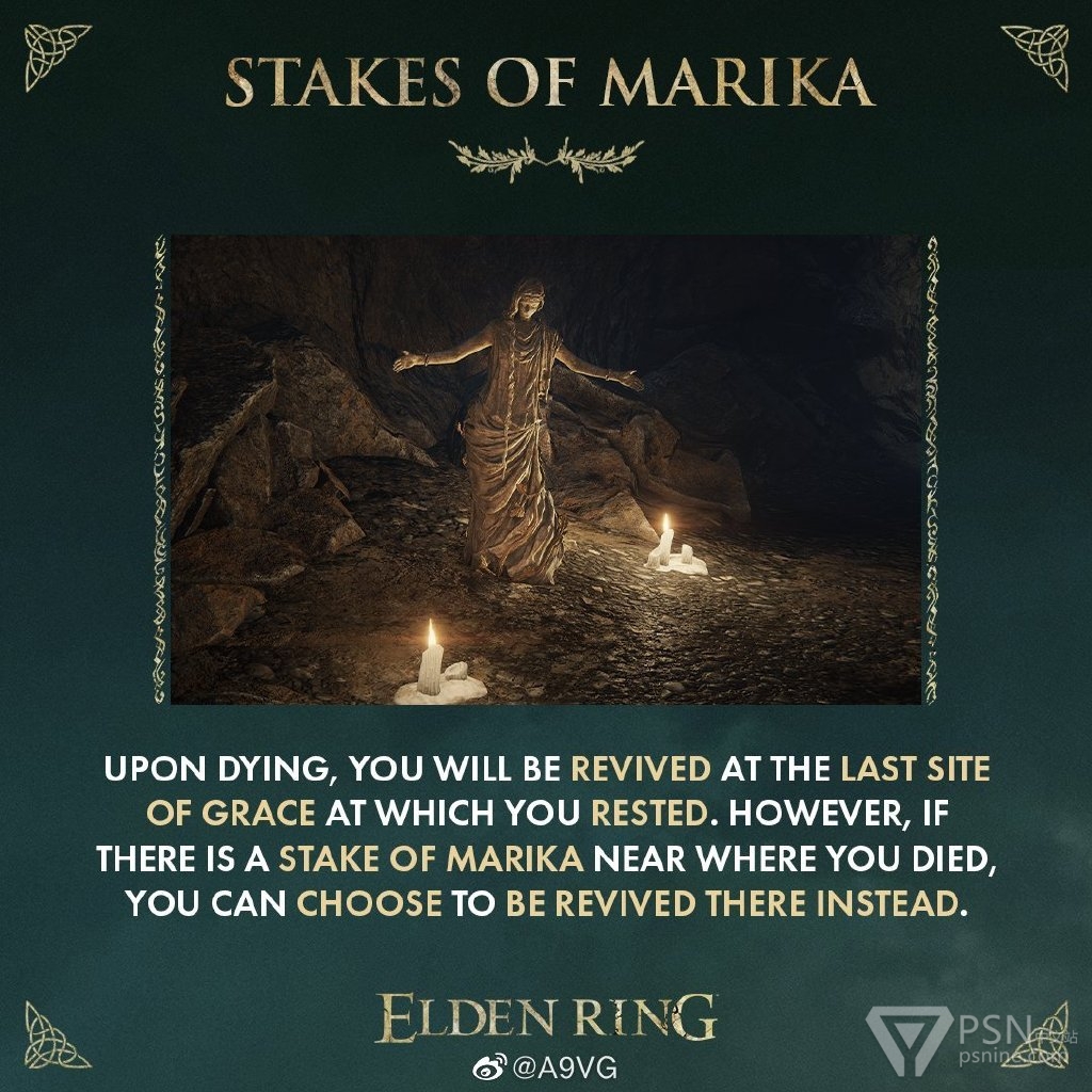 死亡之后,角色将会返回上一个休息过的赐福点,但如果死亡地点附近存在“玛莉卡之桩”,可选择在那里进行复活