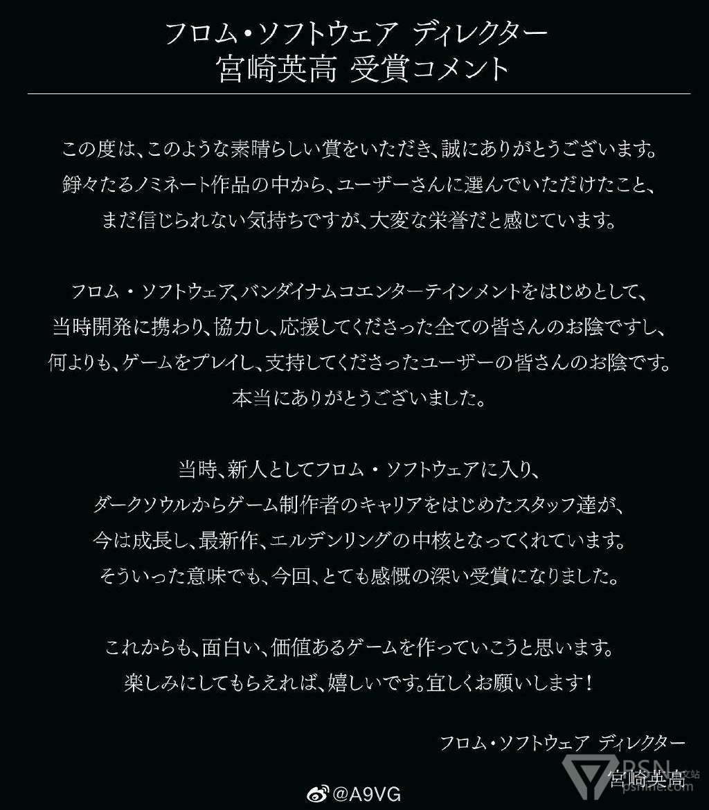 From Software向以Bandai Namco Entertainment为首的所有人致谢,本次能获得这一奖项全都仰仗各位在开发时与我们合作、向我们提供帮助、对我们予以鼓励,更是仰仗游玩这款游戏的玩家们的支持,真的非常感谢大家。