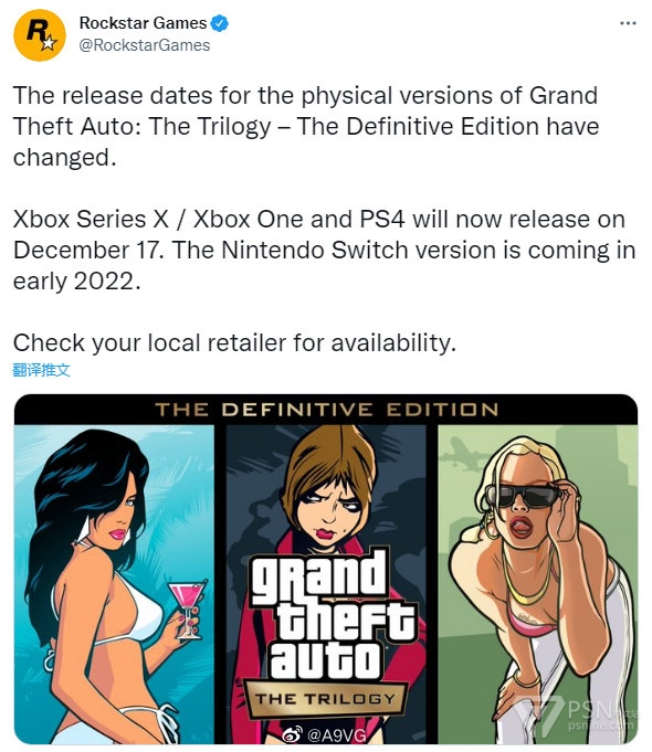 RockStar 更新了《GTA三部曲 决定版》实体版发售日期,Xbox Series、Xbox One和PS4版将延期至12月17日,Switch实体版延期至2022年初发售。