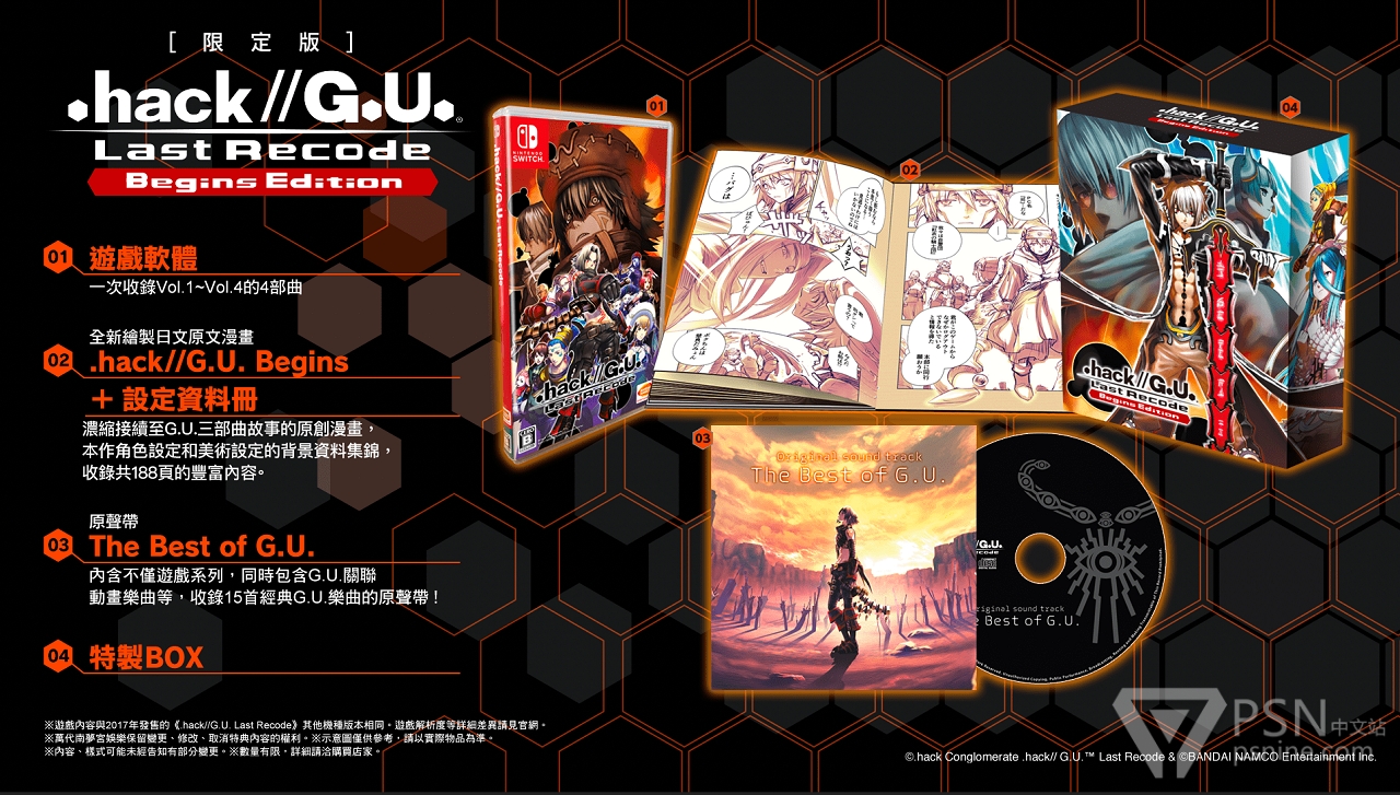 ②全新绘制日文原文漫画“.hack//G.U. Begins”+资料设定集:浓缩接续至G.U.三部曲故事“.hack//SIGN”“.hack”“.hack// Roots”的原创漫画、本作角色设定和美术设定的背景资料集锦,收录其188页的丰富内容。