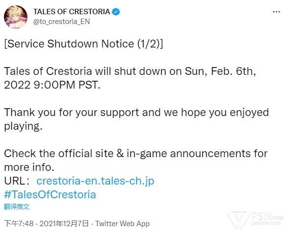 北京时间今晚,《罪纹传说》(Tales of Crestoria)官方宣布:本作将于北京时间2022年2月7日13:00关闭服务器,并已关闭游戏内氪金项目「Gleamstones」的购买。在2月7日前玩家仍可游玩游戏。