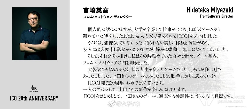 【他改变了宫崎英高】为了纪念上田文人的名作《ICO》发售20周年,来自From Software的宫崎英高特地发来祝贺,并讲述了一段和他的游戏开发者生涯有关的一段往事: