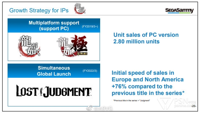 世嘉在近日的一份管理层文件里显示,《如龙》系列自其登陆PC以来,在该平台销量已经突破了280万套,达成这一成绩得力于官方放弃对该系列的独占计划,同时全系列登陆XGP的策略也在其中起到了延长生命周期和提高影响力的作用。此外文件中显示,《审判之逝》在欧美地图的销量相较于前作《审判之眼》提高了近76%。