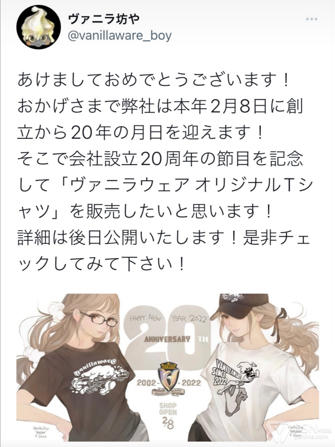 香草社将于2月8日迎来成立20周年纪念,官方决定发售纪念T恤,详情将在日后公开。