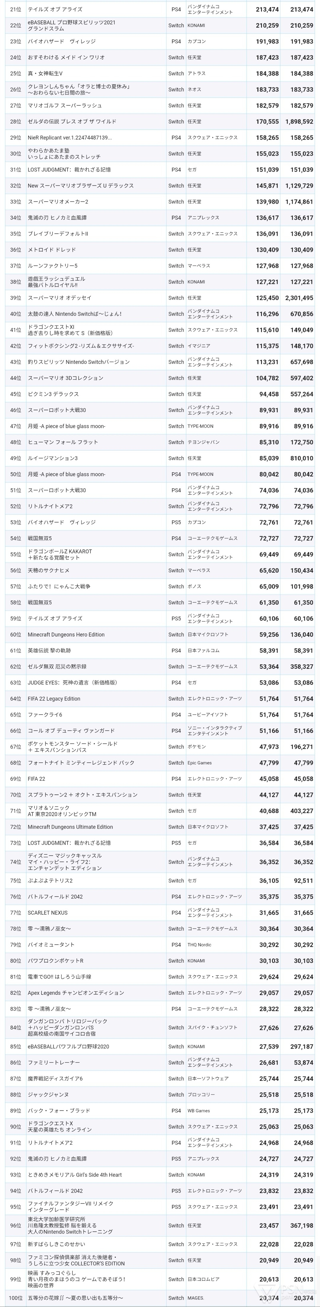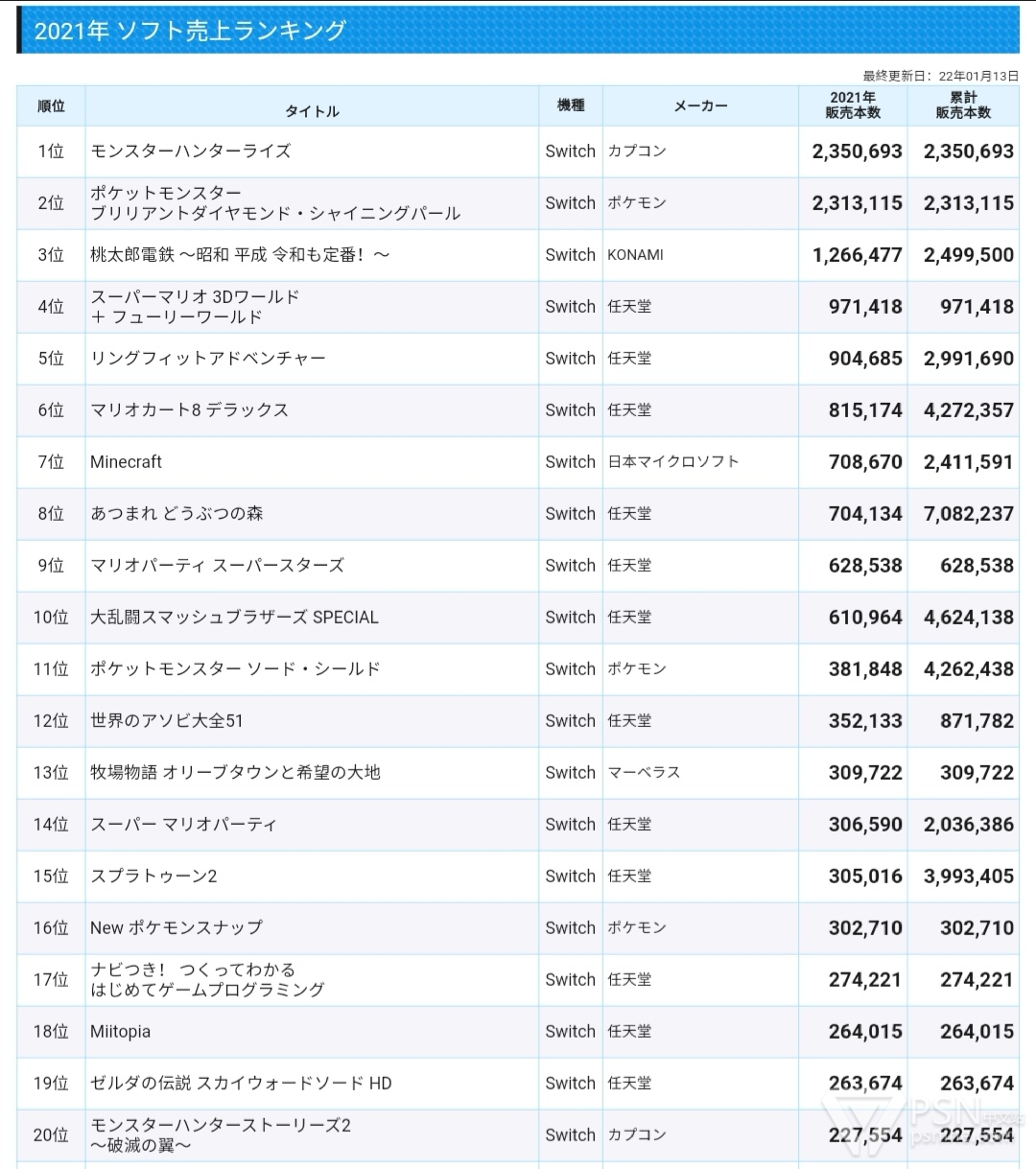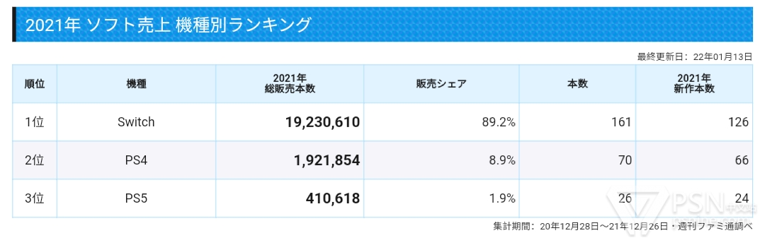teitengame更新2021年的日本实体游戏销量榜(基于fami通数据统计,统计时间:20年12月28日~21年12月26日)和按平台统计数据。