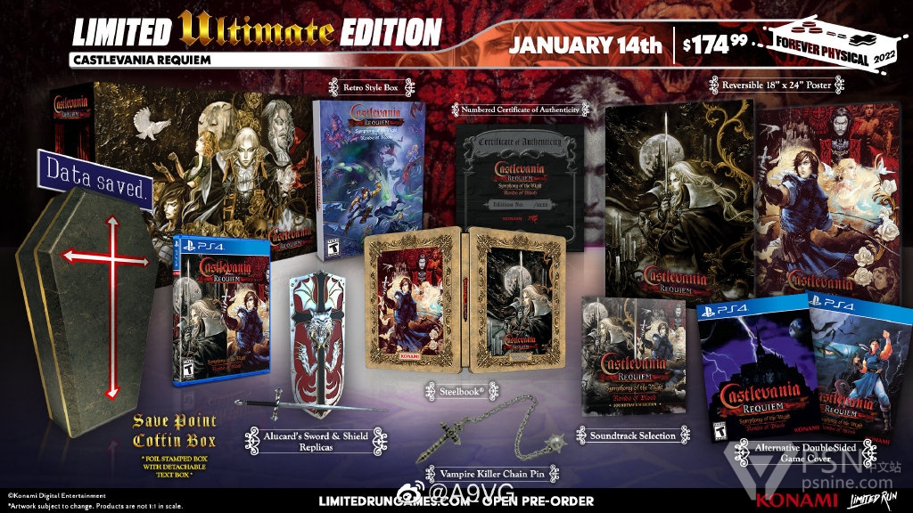 Limited Run《恶魔城安魂曲 终极版》将于2月27日前开放限时预购,售价174.99美元,出货时间预计为预购结束后的8-9个月。包含以下内容: