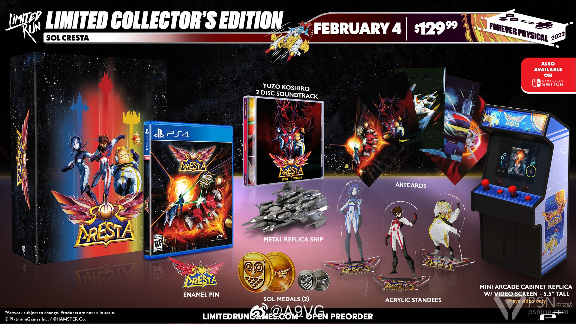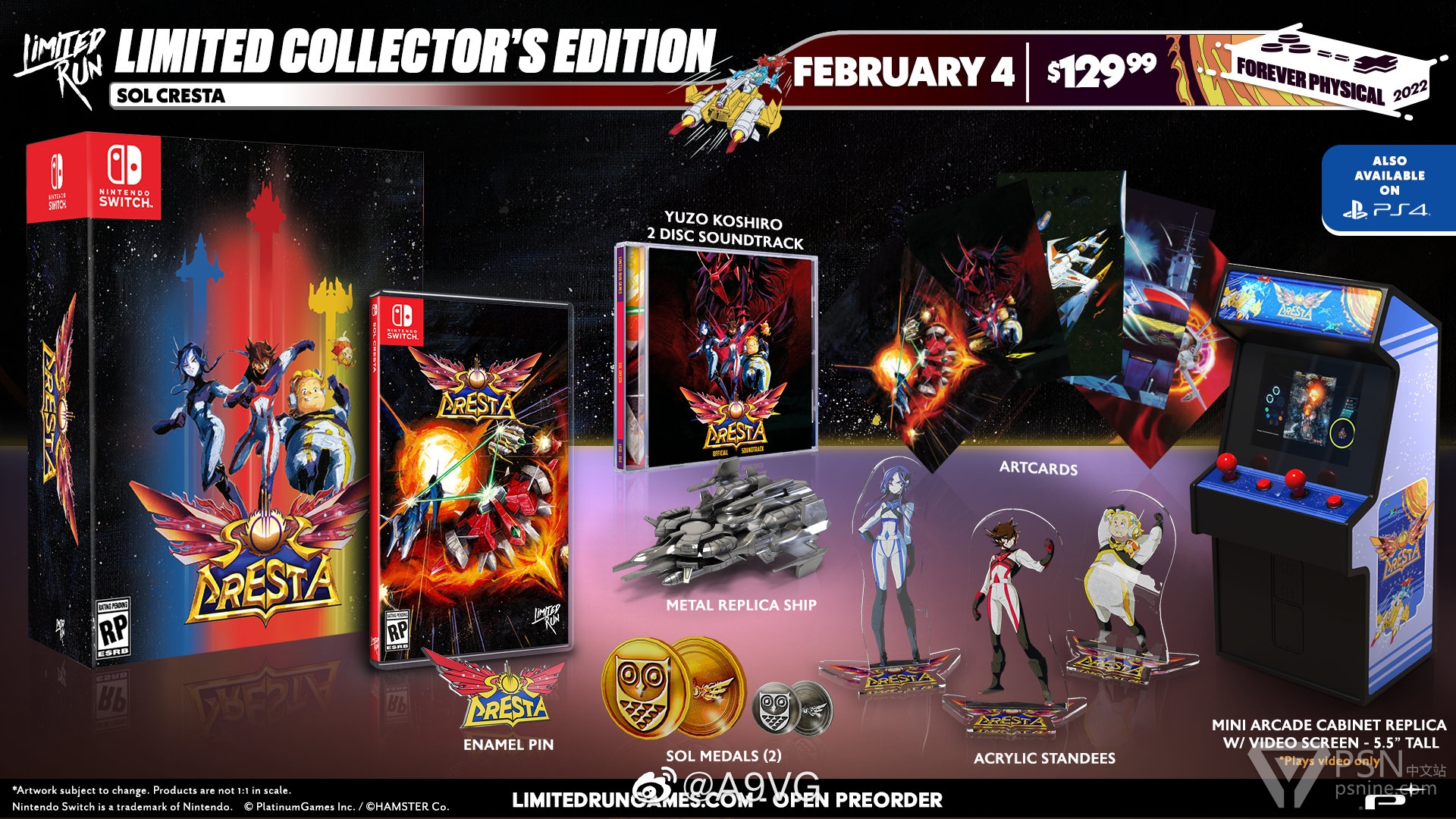 Limited Run Games还将推出本作的PS4和NS实体版,标准版49.99美元,收藏版129.99美元,包含实体游戏、2张原声碟、艺术卡、珐琅徽章、2枚奖牌、复刻金属飞船、亚克力立牌、14cm高的迷你街机(带屏幕,仅用于播放视频)。