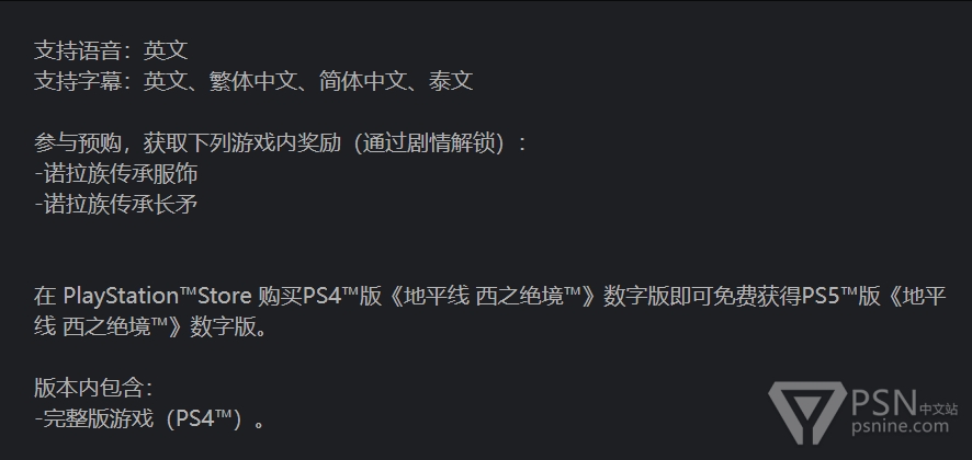 《地平线 西之绝境》数字商店已经更改了文字说明,预购ps4版即可免费拥有ps5版