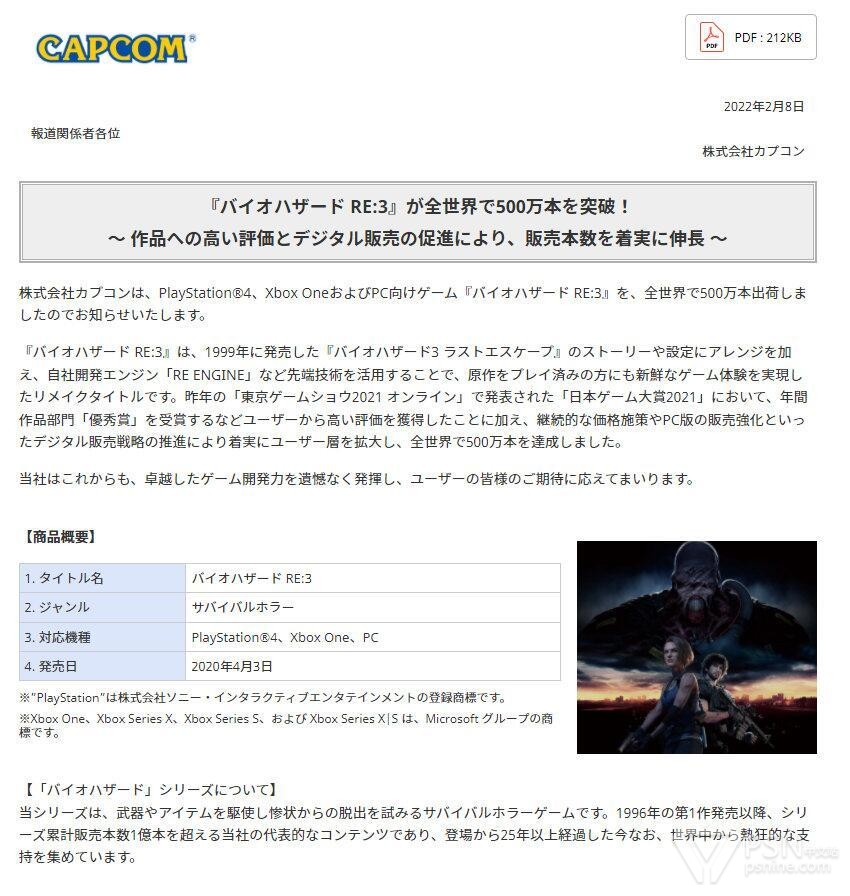 Capcom今日宣布,《生化危机3 重制版》全球出货量突破500万份。