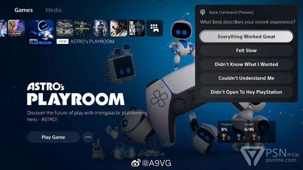 可以使用语音命令来寻找或启动游戏、应用程序、系统设置与PS5媒体播放功能,目前仍在测试阶段。若想使用这项功能,首先需要在选项中启用“语音命令”,然后说出“Hey, PlayStation”并要求PS5主机找到特定的游戏、打开程序、或在播放电影/音乐时进行控制等。(图11)