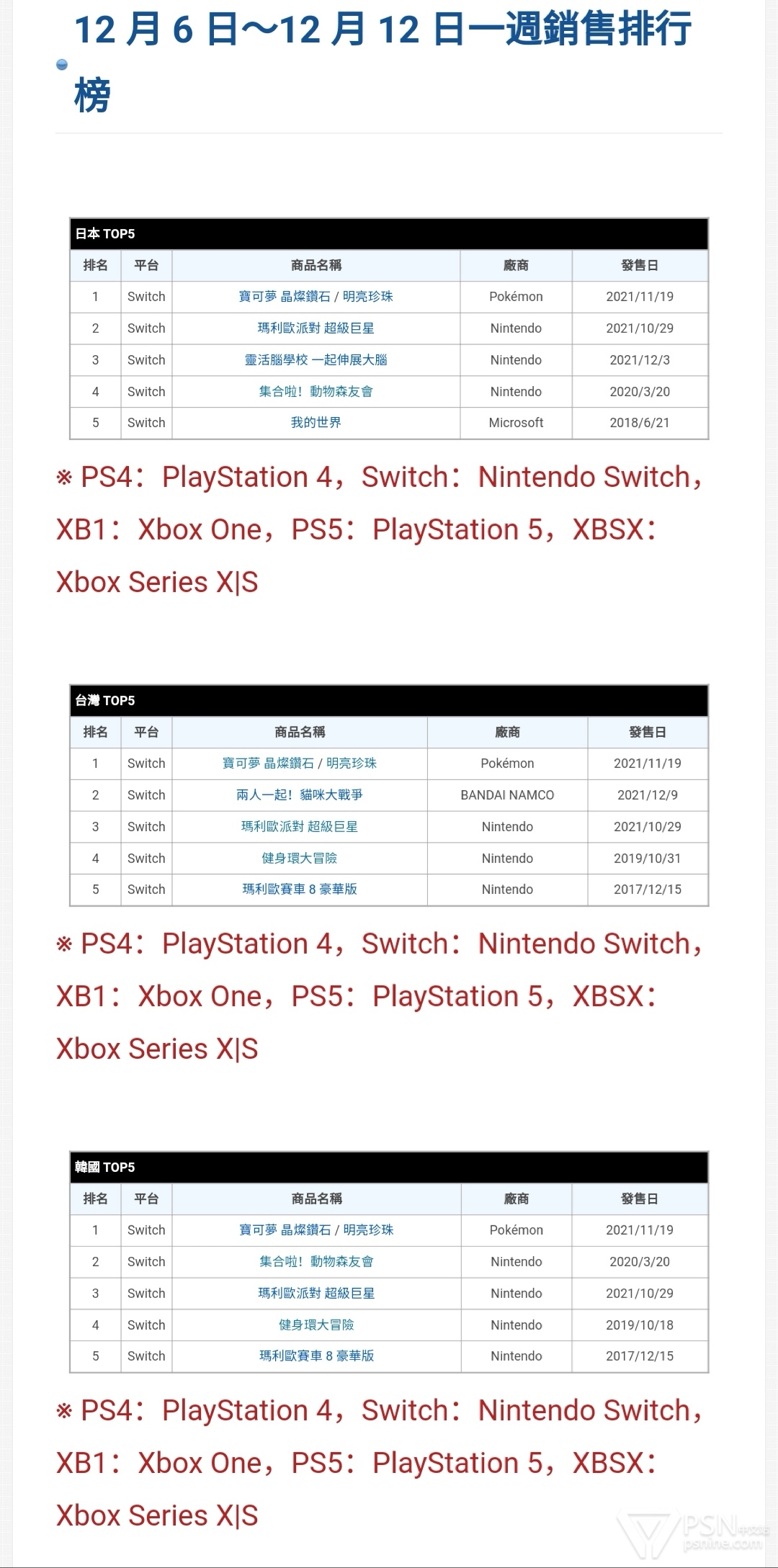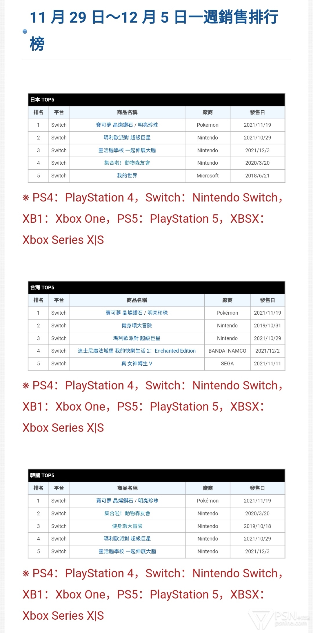 MediaCreate 2021.11.29~2022.01.30期间,日本、台湾、韩国地区每周的销量排行榜: