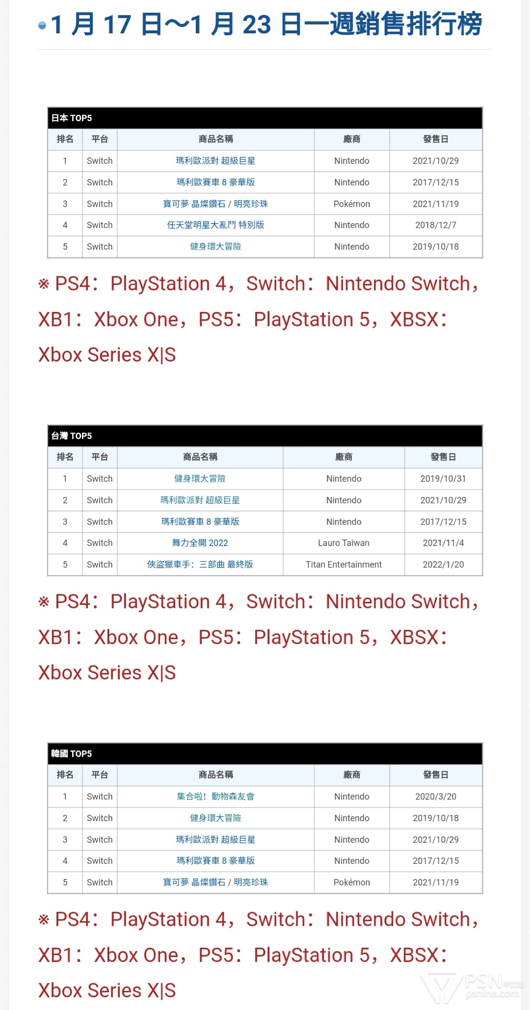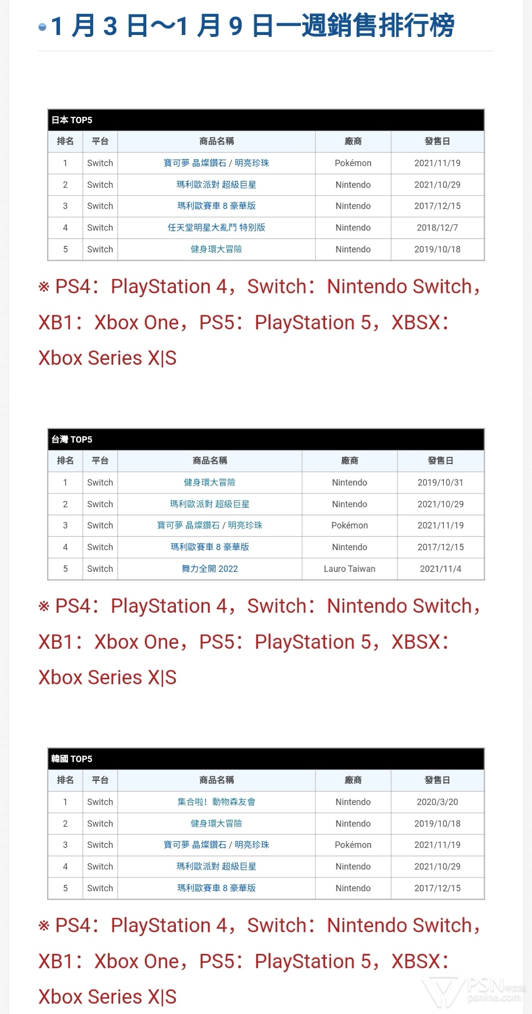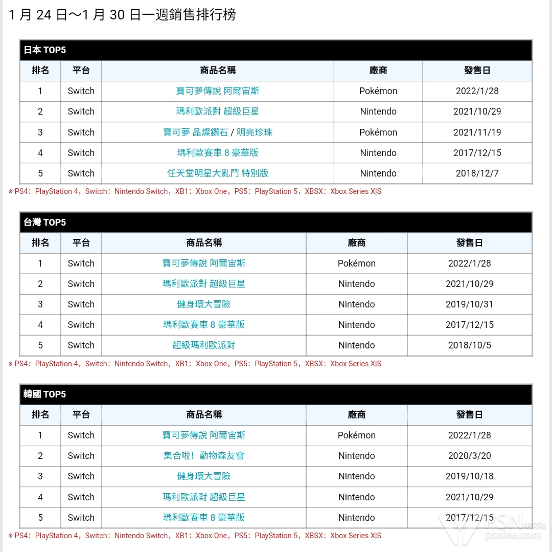 此间有《真三国无双8帝国》《宝可梦传说阿尔宙斯》《GTA三部曲》等新游戏入榜,大部分时间由老游戏霸榜,PS版游戏仅一次进入台湾榜。