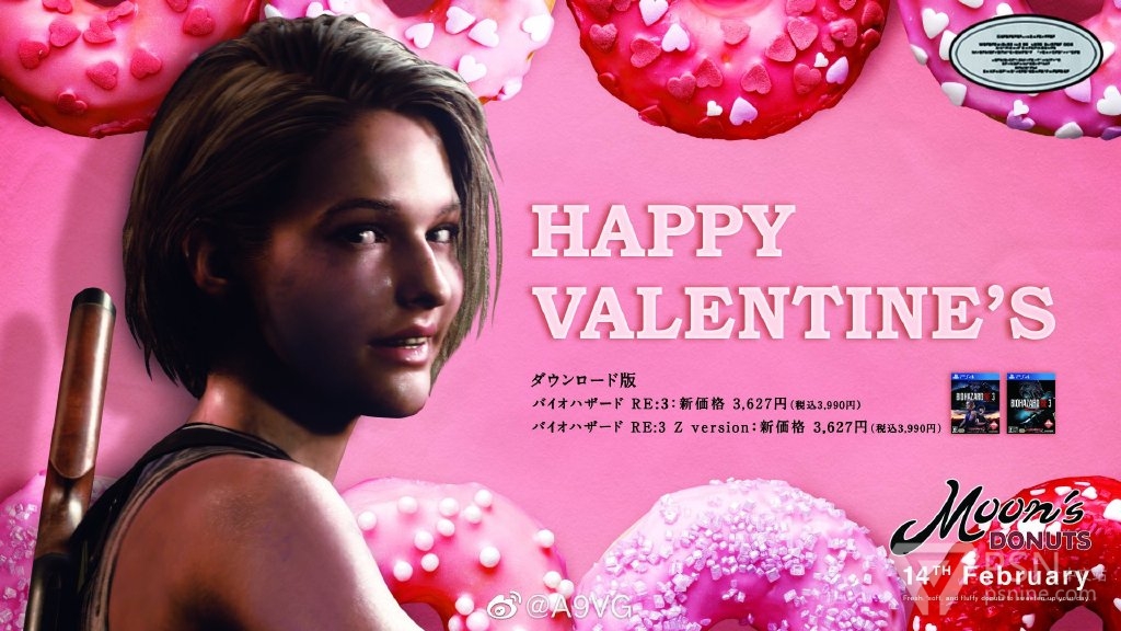 Capcom官推公开情人节贺图,同时宣布《生化危机3 重制版》日文版将实现价格永降,新价格为3990日元(含税),《生化危机 浣熊市合集》(重制版2代+3代)新价格为6990日元(含税)。