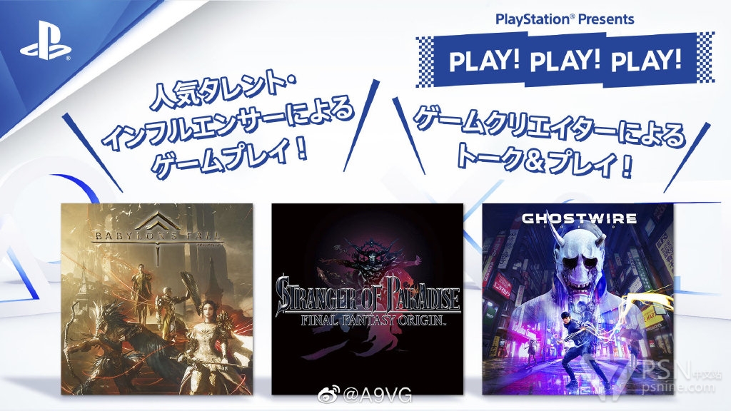 SIEJA宣布将举办三场“PLAY! PLAY! PLAY!”直播活动,分别以《巴比伦陨落》《最终幻想起源 天堂的陌生人》与《幽灵线东京》为主,具体日程与内容如下: