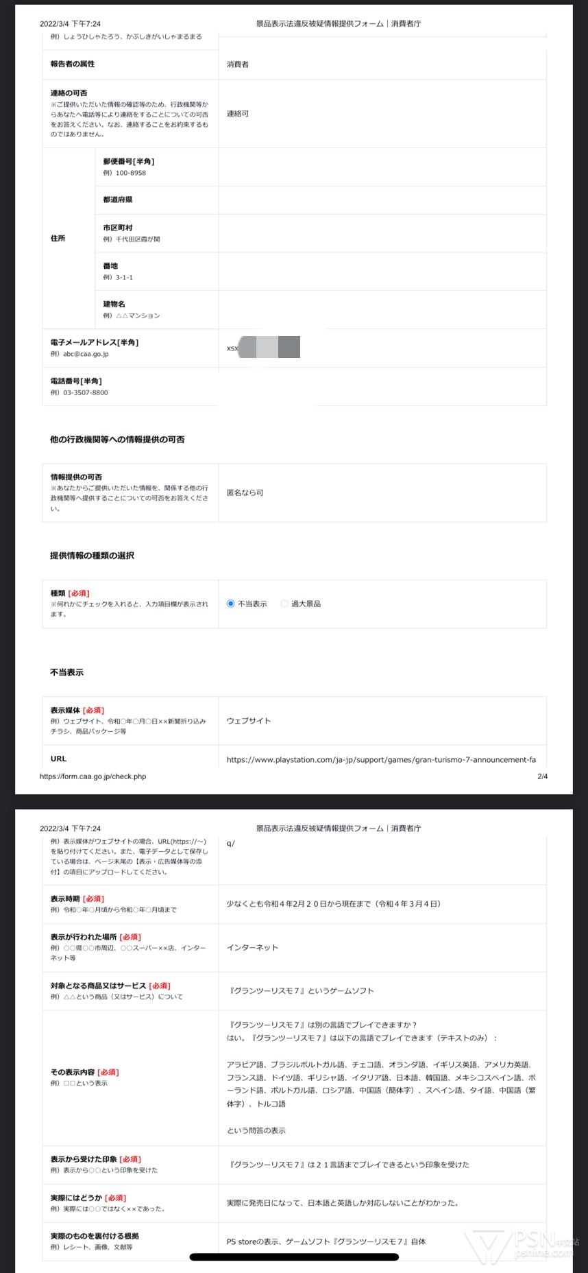 保存FAQ页面,ps store页面。去网页对SIE提交了违反景品表示嫌疑的情报提供,如图。