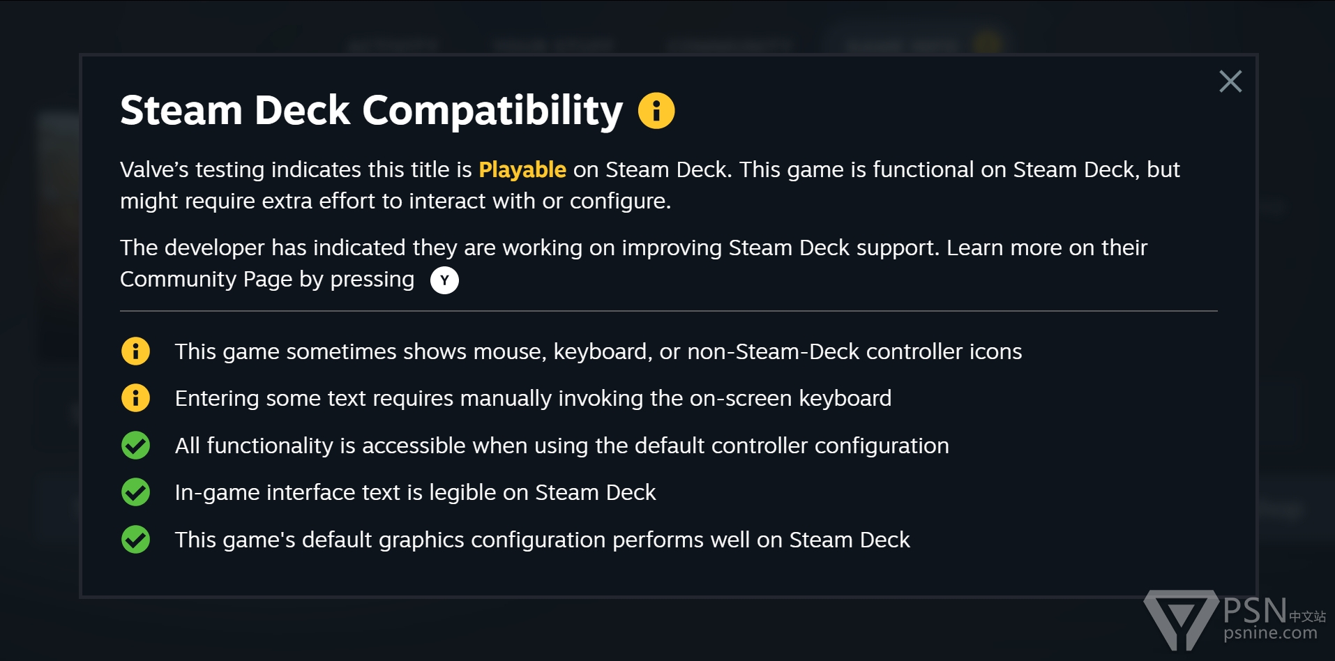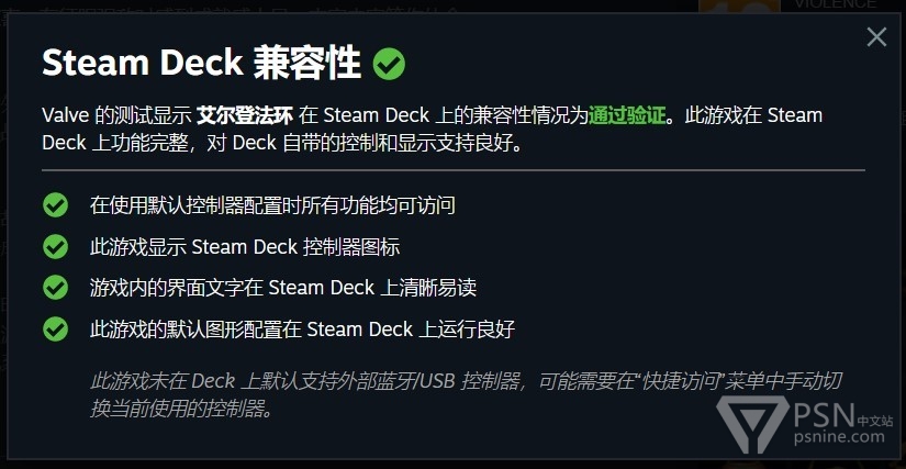 关于“通过验证”和“可玩”的标准,Valve 举例解释:“通过验证”是最高标准,如果游戏在99%的时候都显示控制器图标,但有时候会在游戏过程中让您“按下F键”,那就只能算“可玩”。