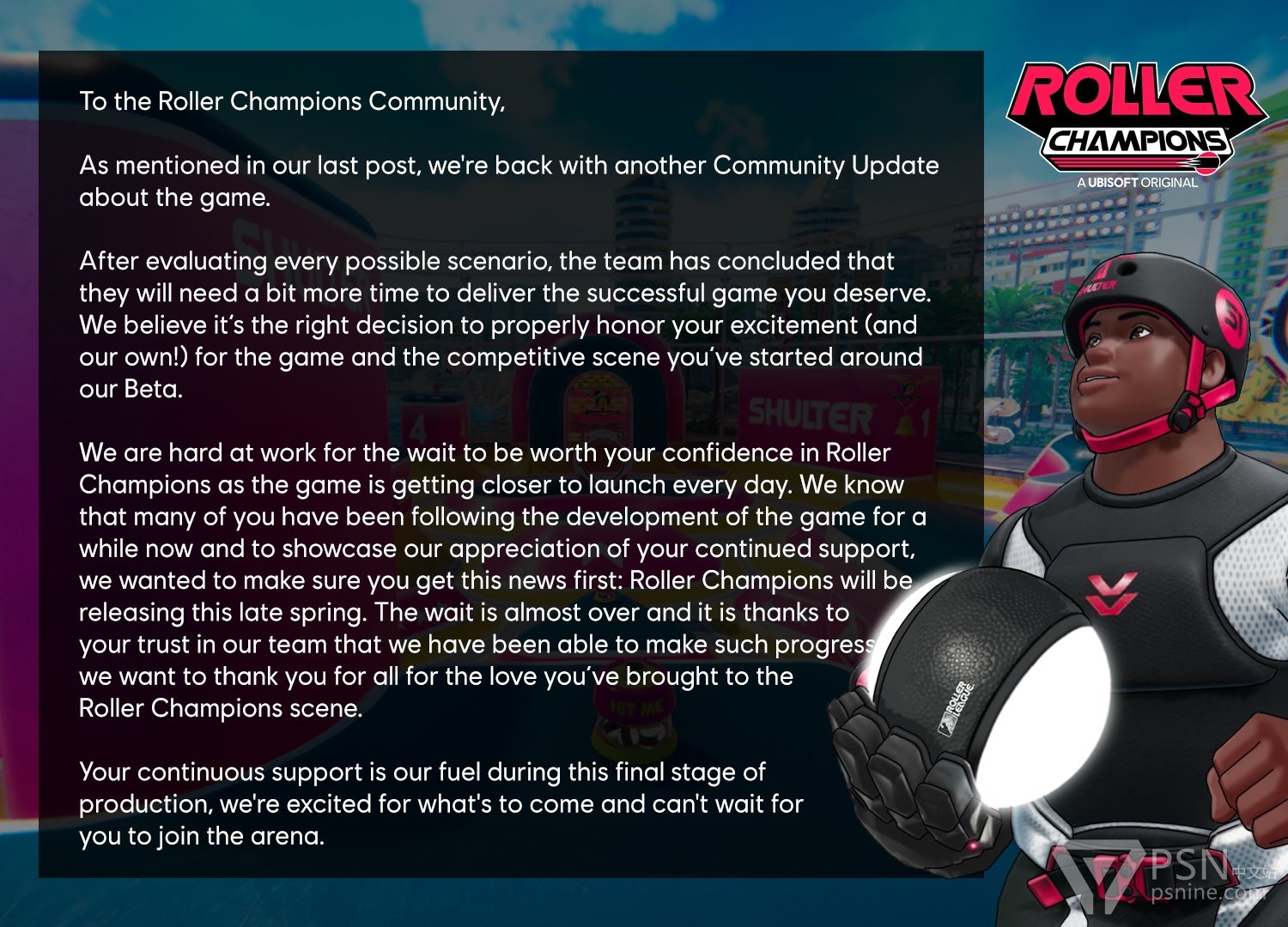 “我们知道你们中的很多人已经关注本作的开发进程有很长一段时间了。为了表达对你们持续支持的感激之情,我们想确保你们能首先得到这个消息:《冠军冲刺》将于今年春末(this late spring)推出。”