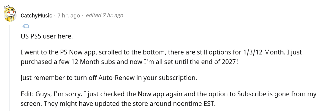 ! 所以我想着赶紧一口气买五年,以身试法,重塑PS5发售时大家代领游戏的荣光,结果发现官网只有单月购买一个选项了($9.99),其他靠谱的充值卡网站像亚马逊,CDKeys和Playasia都下架或者没货了,不靠谱的实体充值卡可能买来也失效了,真的是一点便宜不让我们赚啊哈哈哈