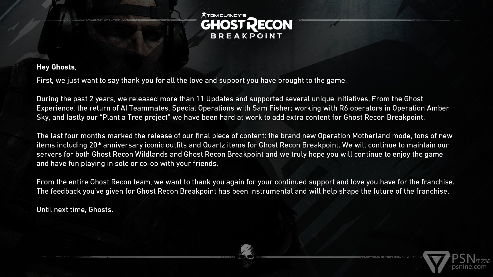 《幽灵行动:断点》更新工作完成,后续不会再有新的内容更新。游戏的服务器会继续开放。