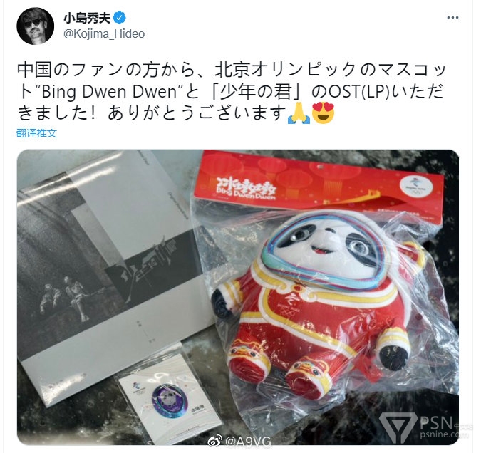 小岛秀夫:中国粉丝送给我的北京奥运会吉祥物“冰墩墩”与「少年的你」音乐原声集,非常感谢!